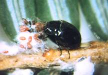 Horticultural oil (2 % or lower) or insecticidal soap sprays can be applied at anytime but preferably in spring, to suffocate HWA on accessible trees but applications are costly and impractical for large scale control. Coverage needs to be thorough to be effective and needs to be repeated annually to prevent reintroductions from taking hold. These least toxic options are preferable to other pesticides as there are minimal impacts on beneficial or non-target organisms. Chemical control is also limited in its use in the forest setting, although newer chemicals such as imidacloprid (Bayer Corporation) are increasingly used for systemic treatments by arborists to control HWA. Soil drench imidacloprid applications are now available for homeowner use. However, the chief hope for long term HWA management remains biological control using introduced specialist predators from Japan , China and British Columbia , Canada . The only mass-reared predator from Japan currently available for implementation in infested eastern states is Pseudoscymnus tsugae (Coleoptera:Coccinellidae), a tiny black ladybeetle, about 2mm in length, of the Tribe Scymnini from Japan (Fig. 8). Over eight years of careful research at the Connecticut Agricultural Experiment Station, largely supported by the USDA Forest Service, has documented its life history, biology and potential as a biological control agent, including experimental field releases and short-term impact on HWA in Connecticut and Virginia . Field release sites are still being monitored and assessed three to five years after release. The predator is considered established in Connecticut where overwintering adults have been recorded yearly since its first release in 1995 and reproduction has been documented in the field. To date, nearly a million P. tsugae have been released in over 100 sites in 15 eastern states from Georgia to Maine and this species has also been recovered from release sites in other states. Other related ladybeetle predators from China (various Scymnus species), and a derodontid beetle, Laricobius nigrinus , from British Columbia, are under investigation as additional biological control agents at the USDA Forest Service, Hamden, Connecticut, and at Virginia Polytechnic and State University, respectively. Yet another avenue being explored is that of entomopathogenic fungi for biological control of HWA at the University of Vermont.