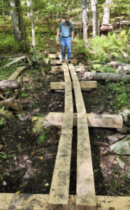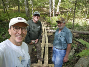 Wolf Den Land Trust and the town of Killingly Conservation Commission share access to a parking area and trail between the WDLT property and the abutting town of Killingly 1892 Conservation Area. The access trail to both properties passes through the Sherman Memorial Forest and a 20-year old “bog bridge” over a wetland area that had deteriorated requiring replacement. We were happy to receive the assistance from the KCC members Bob Loftus and Bob Mullen in the completion of the bridge. The KCC also paid 50% of the cost of the materials and the Killingly town crew cut down several dangerous leaning poplar trees that were directly over the bog bridge. Due to the sensitive nature of the wetland, we decided not to use pressure treated wood that might leech out potentially harmful chemicals into the wetland. At the suggestion of Eastern Connecticut Service Forester Frank Cervo, we purchased native white oak from SNG Woodworks LLC in Canterbury. ECFLA/WDLT appreciates the assistance of of the Killingly Conservation Commission for this important project. Both properties are now safely accessed for the public use.